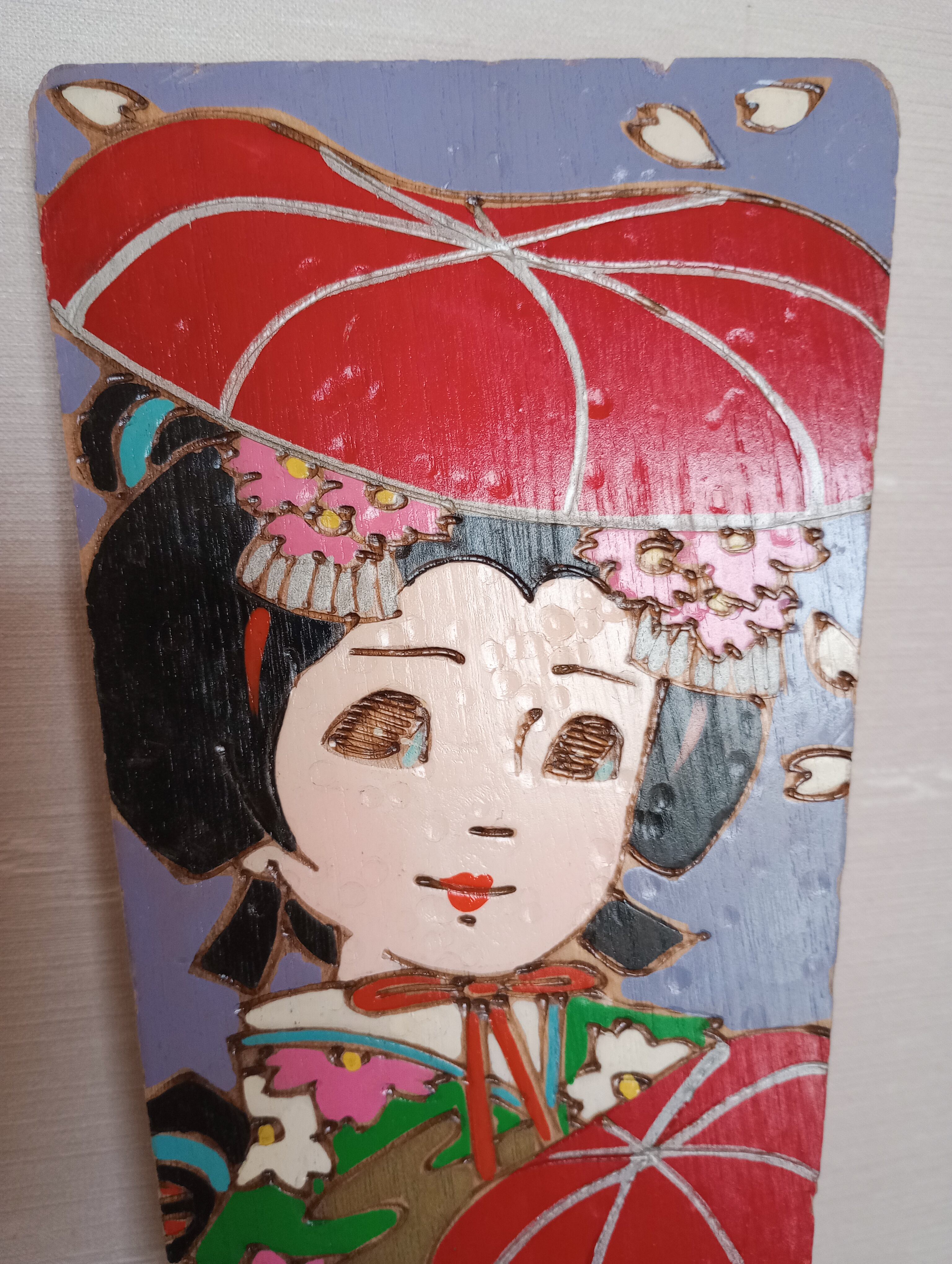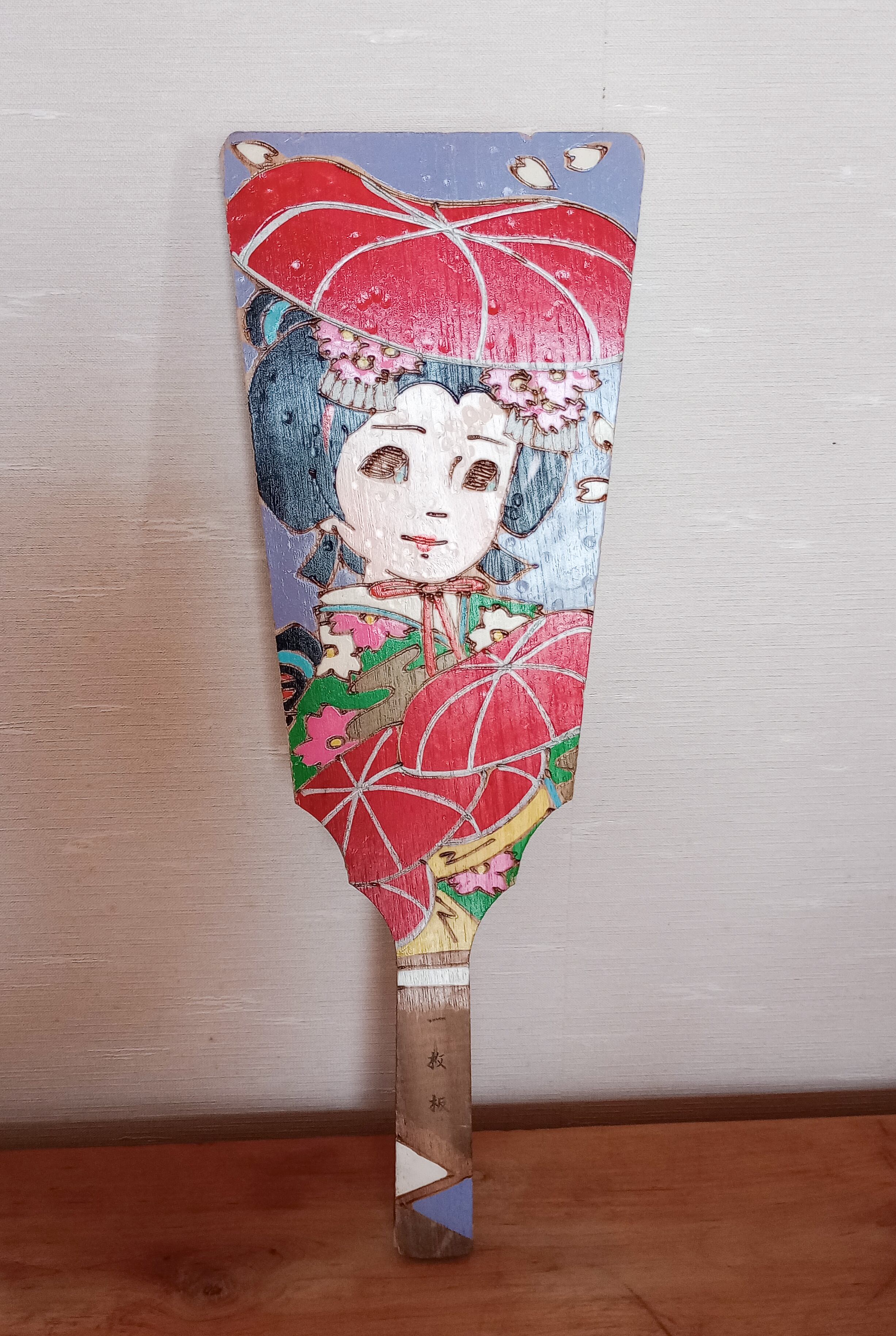 レトロな羽子板 大型 当時物 / 女の子 (藤色×緑着物)